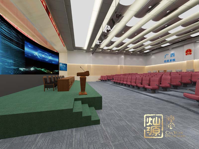 再次,南寧多功能會(huì)議室裝修改造是在燈光改進(jìn)方面,在主席臺(tái)的正前方新安裝舞臺(tái)聚光燈一排,主要目的是在召開會(huì)議的時(shí)候,加強(qiáng)舞臺(tái)的亮度和提成層次感,再就是把原來舞臺(tái)上方的片燈做成大面積的發(fā)光的軟膜天花,使整個(gè)會(huì)議室明快整體,主要目的還是加強(qiáng)了燈光效果,觀眾席上方的弧形鋁塑板天花也進(jìn)行了局部的改造,增強(qiáng)了整體空間的亮度和光感。